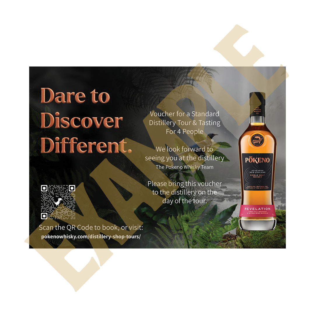 A voucher for four people to the Pōkeno distillery Tasting Tour, for approximately 45 minutes to an hour, which runs every Saturday, with a tasting of two of their single malts at the end.
