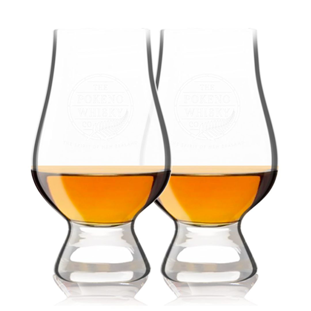 Two Pōkeno engraved Glencairn tasting glasses. Designed specifically for whisky, the wide bowl of these glasses allows for the fullest appreciation of the whisky's colour while the tapering mouth captures and focuses the aroma on the nose.