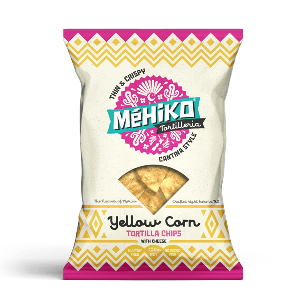 Freshly baked NZ East Coast grown yellow corn tortillas sliced it into quarters and then seasoned with natural cheese flavouring. A great chip for homemade nachos or dipping.