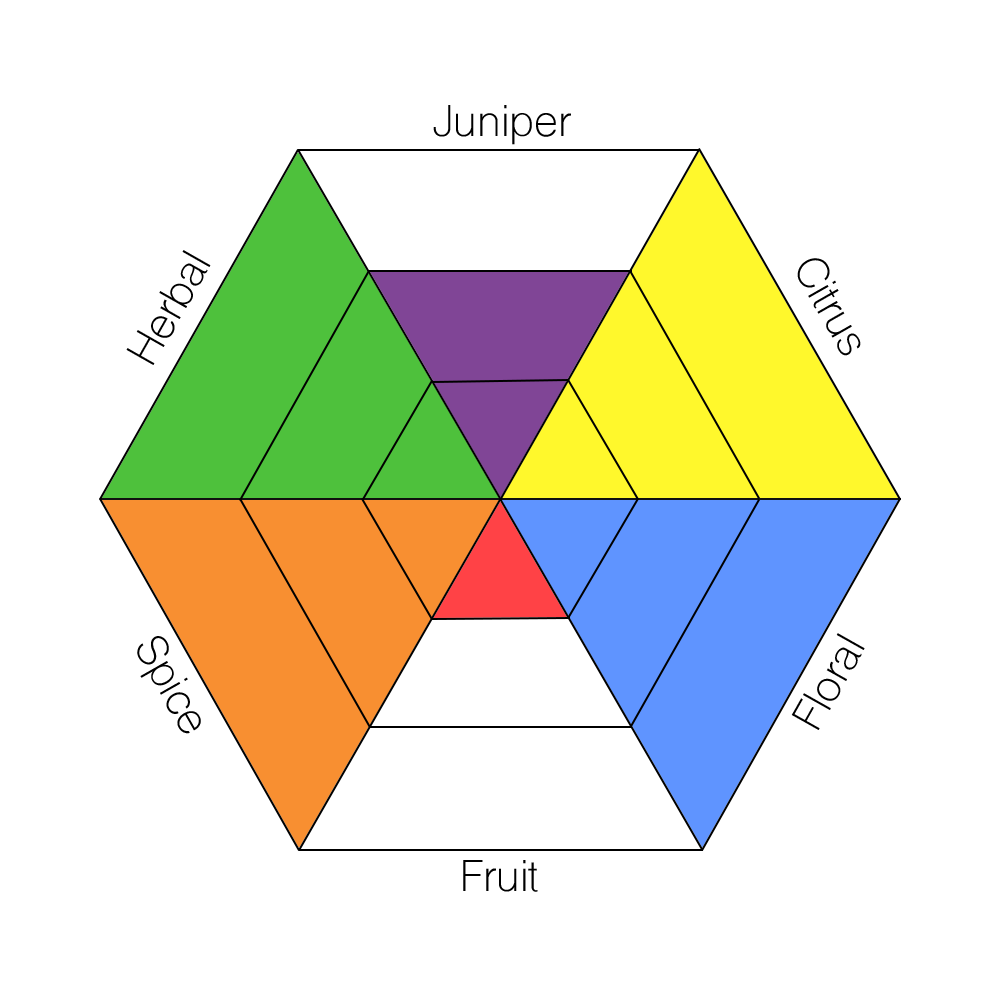 The main taste profiles in gin are: Juniper, Citrus, Floral, Fruit, Spice, and Herbal.