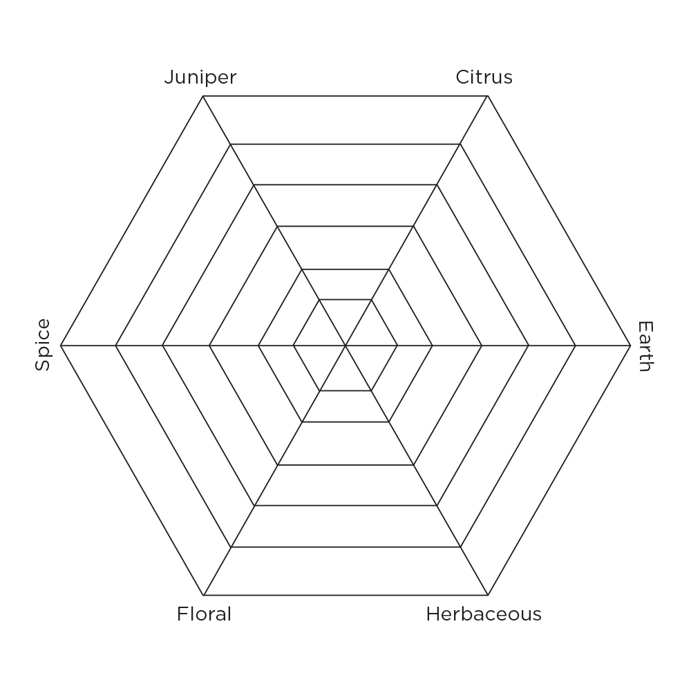 The main taste profiles in gin are: Juniper, Citrus, Floral, Fruit, Spice, and Herbal.