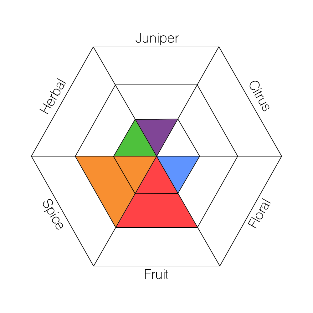 The main taste profiles in gin are: Juniper, Citrus, Floral, Fruit, Spice, and Herbal.