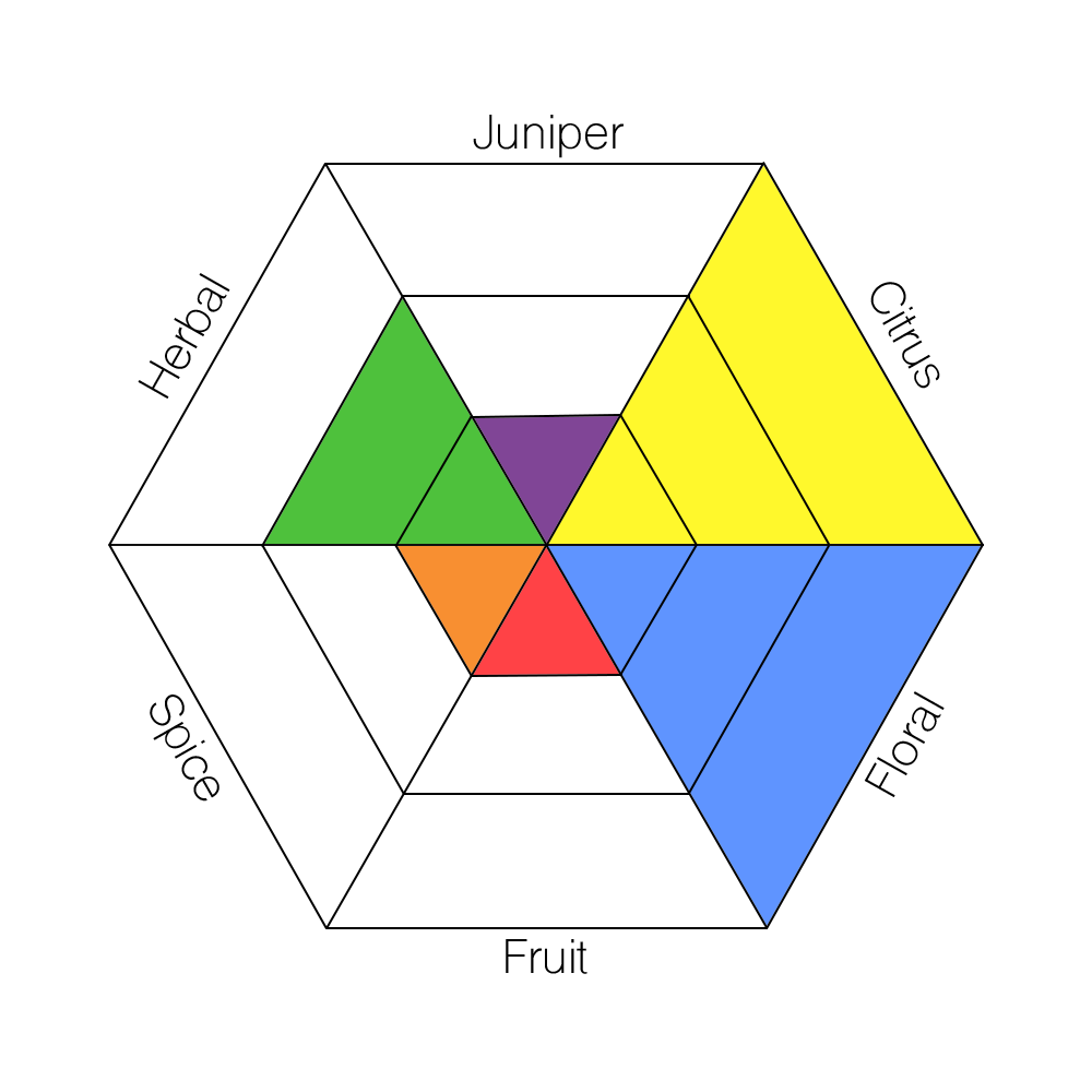 The main taste profiles in gin are: Juniper, Citrus, Floral, Fruit, Spice, and Herbal.