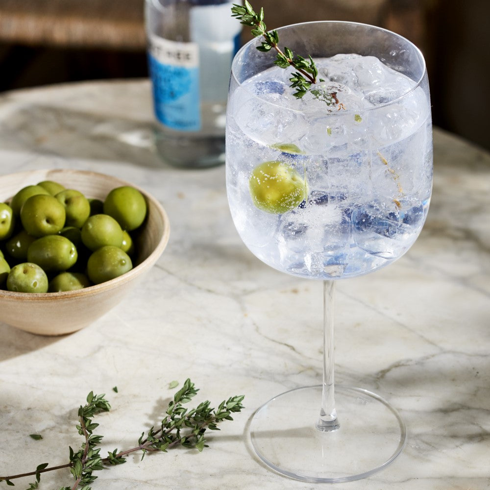 - Pour the gin into a copa or wine glass filled with ice cubes