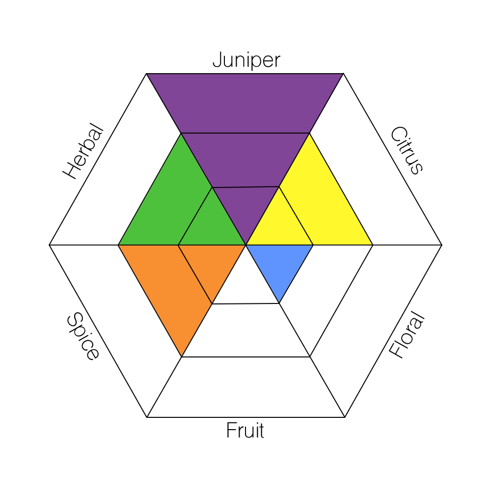 The main taste profiles in gin are: Juniper, Citrus, Floral, Fruit, Spice, and Herbal.