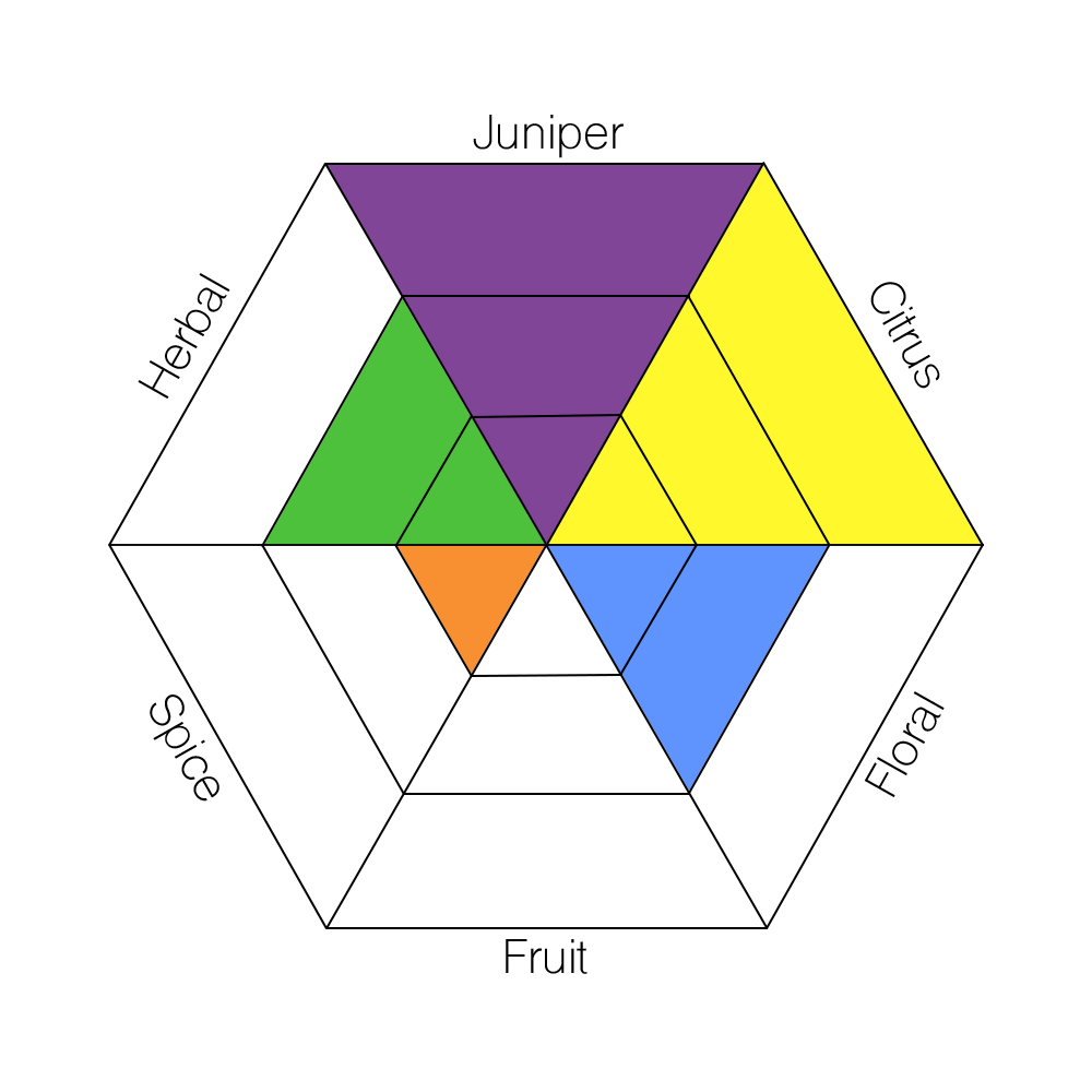 The main taste profiles in gin are: Juniper, Citrus, Floral, Fruit, Spice, and Herbal.