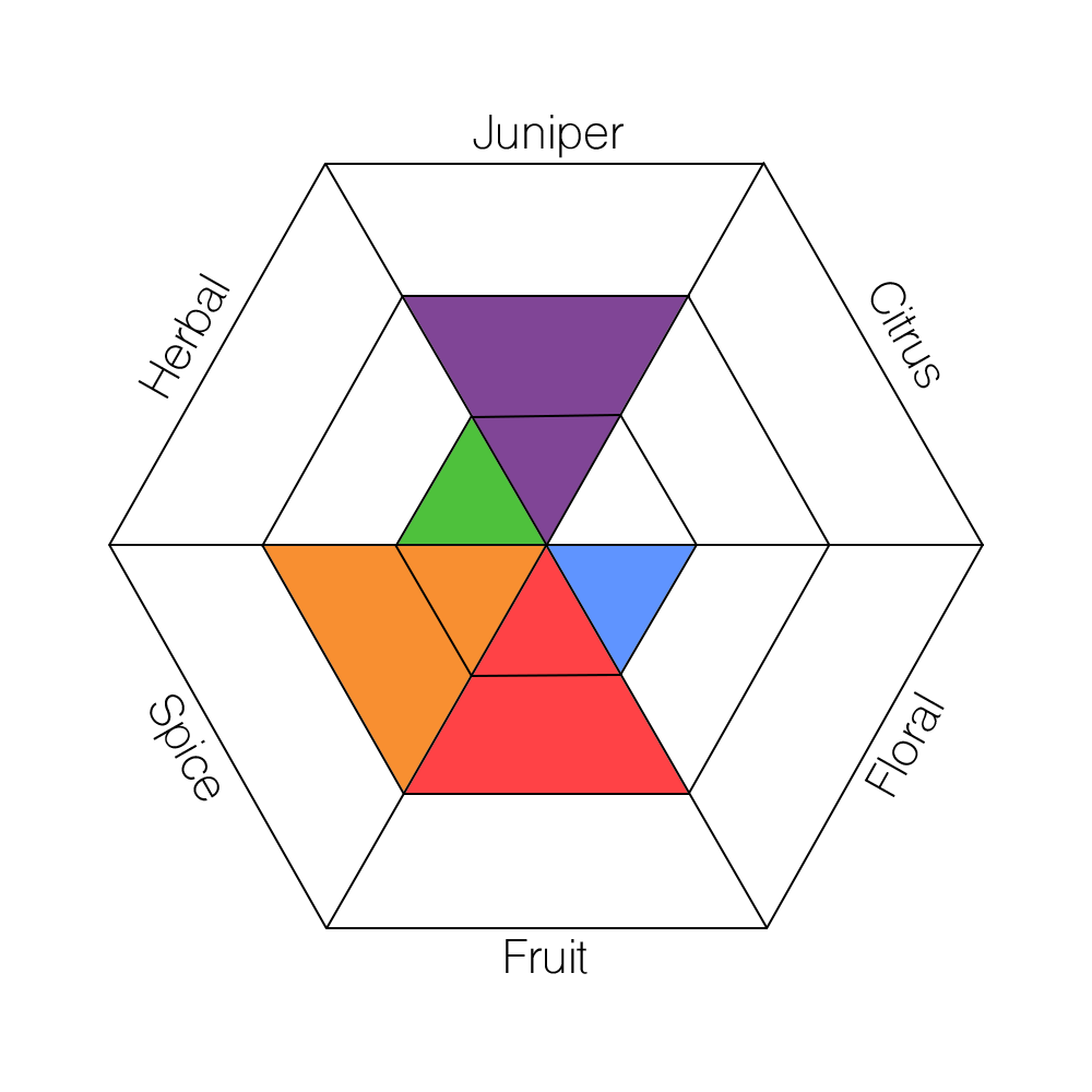 The main taste profiles in gin are: Juniper, Citrus, Floral, Fruit, Spice, and Herbal.