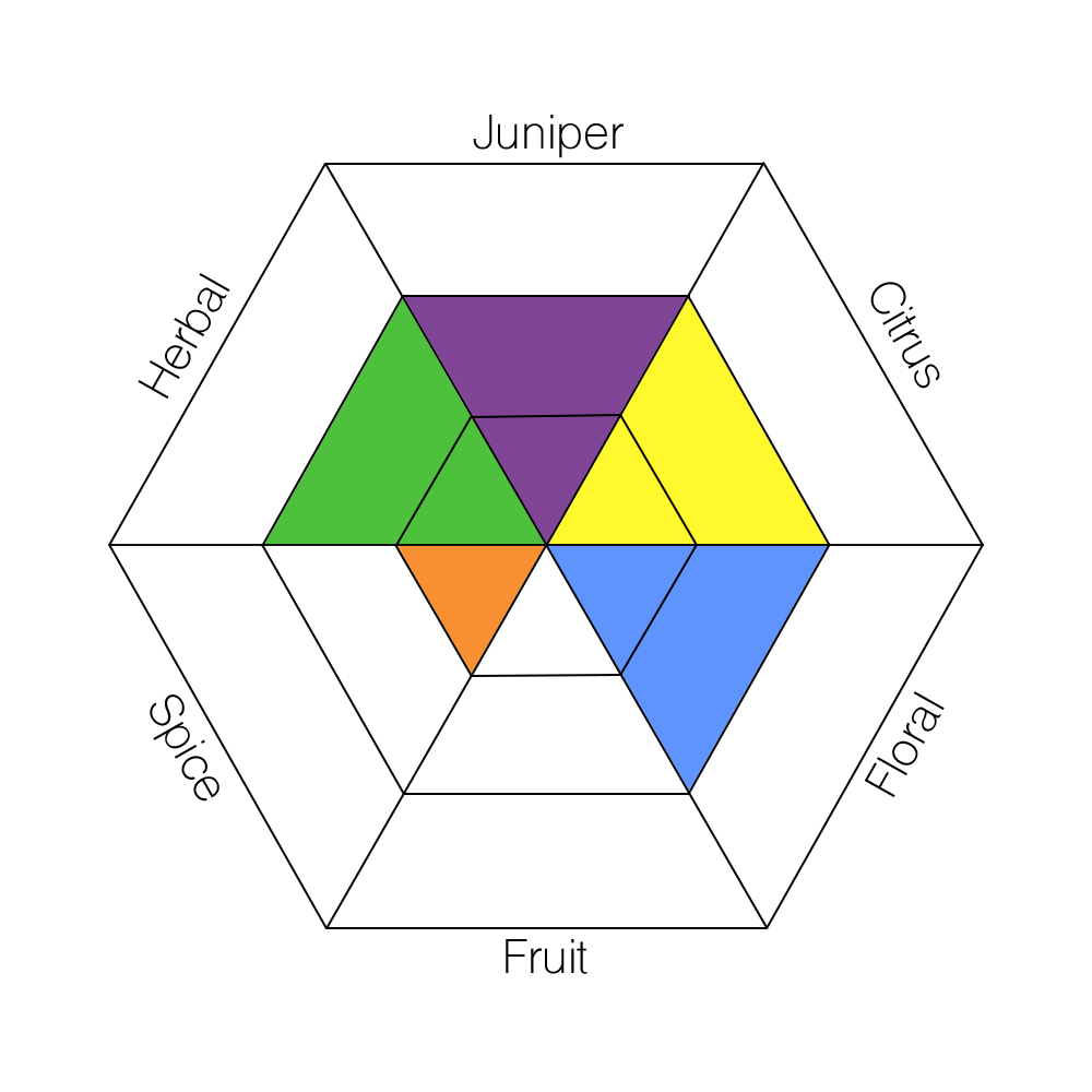 The main taste profiles in gin are: Juniper, Citrus, Floral, Fruit, Spice, and Herbal.