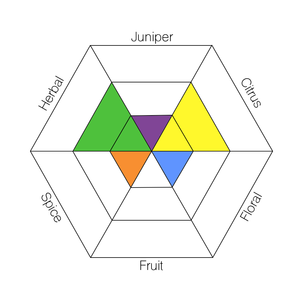 The main taste profiles in gin are: Juniper, Citrus, Floral, Fruit, Spice, and Herbal.