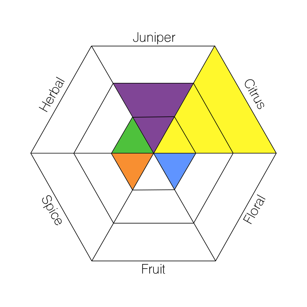 The main taste profiles in gin are: Juniper, Citrus, Floral, Fruit, Spice, and Herbal.