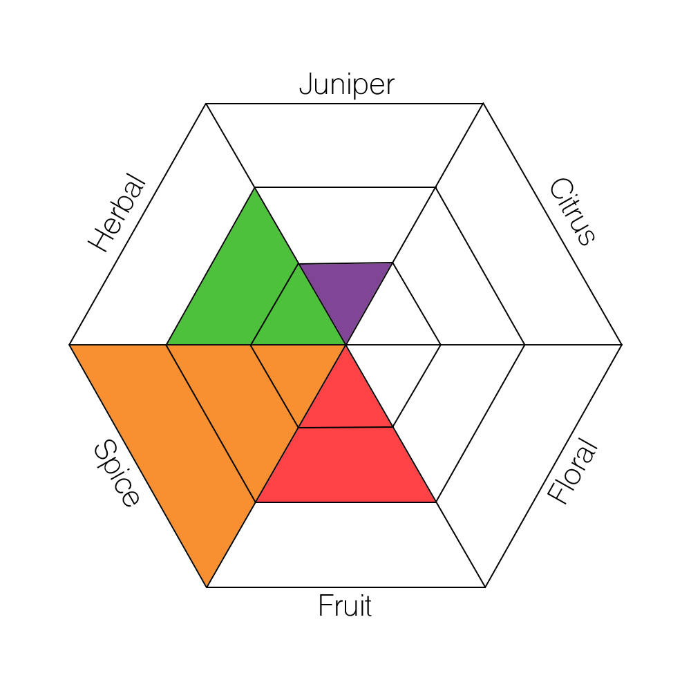The main taste profiles in gin are: Juniper, Citrus, Floral, Fruit, Spice, and Herbal.