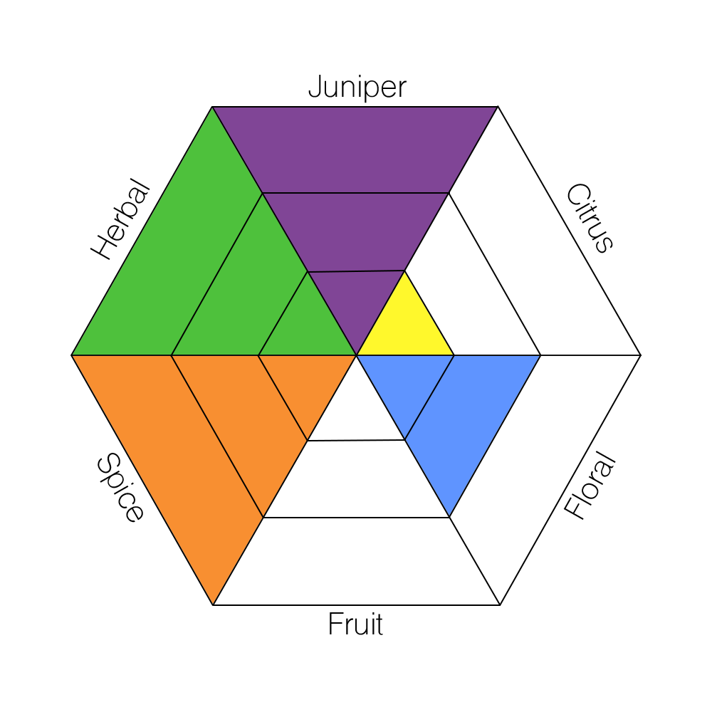 The main taste profiles in gin are: Juniper, Citrus, Floral, Fruit, Spice, and Herbal.