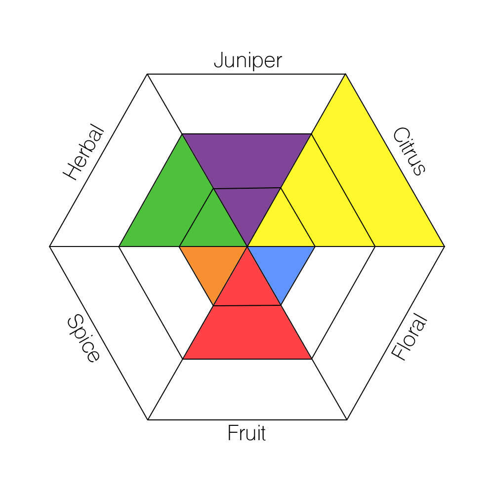 The main taste profiles in gin are: Juniper, Citrus, Floral, Fruit, Spice, and Herbal.
