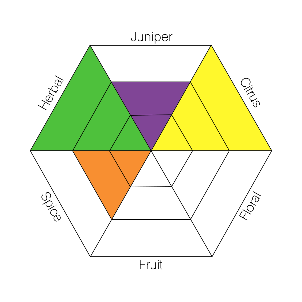 The main taste profiles in gin are: Juniper, Citrus, Floral, Fruit, Spice, and Herbal.
