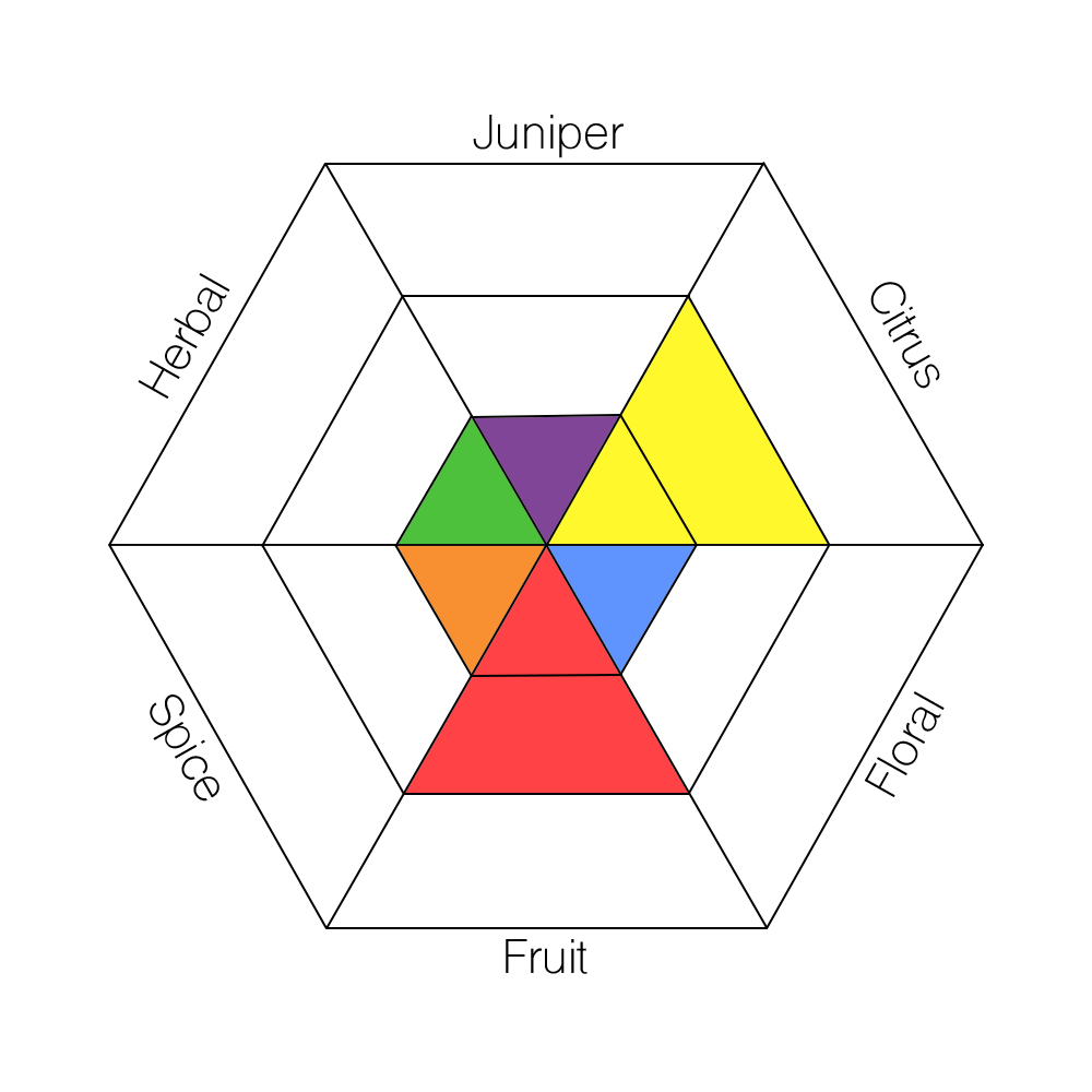 The main taste profiles in gin are: Juniper, Citrus, Floral, Fruit, Spice, and Herbal.