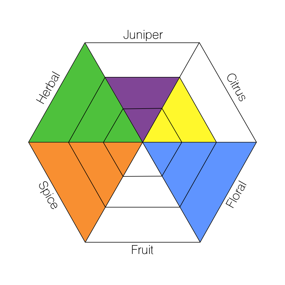 The main taste profiles in gin are: Juniper, Citrus, Floral, Fruit, Spice, and Herbal.